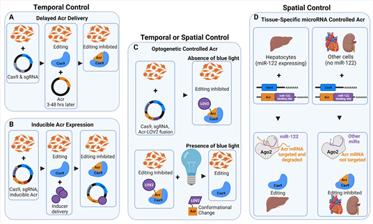 Several approaches can modulate when and where CRISPR–Cas9 is active: (A) Delaying Acr delivery allows editing to occur first, followed by timed inhibition. (B) Acr expression can be switched on later using inducible promoters or chemical triggers. (C) Fusions with light-responsive domains enable optogenetic control, where illumination determines Acr activity in specific regions or time windows. (D) Tissue-restricted microRNAs can selectively suppress Acr transcripts, providing organ- or cell-type–specific regulation of Cas9 (1).