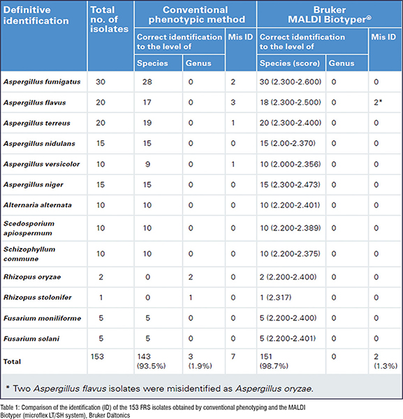 In 2017, the Microbiology Laboratory of Beijing Tongren Hospital evaluated the performance of MALDI-TOF MS (microflex LT/SH system, Bruker Daltonics, Bremen) in identifying 153 different FRS filamentous fungi isolates.1 The results showed that 151 out of 153 FRS isolates had correct species identification (98.7 per cent) (Table 1). The rate was significantly higher than that of the traditional phenotypic methods (93.5 per cent). MALDI-TOF MS was capable of identifying very closely related species including Aspergillus versicolor (1), Aspergillus flavus (3), Aspergillus fumigatus (2) and Aspergillus terreus (1), which were indistinguishable with conventional phenotypic methods. The MALDI-TOF MS method has proven to be more accurate and quicker than phenotypic methods for the identification of filamentous fungi in clinical microbiology laboratories.